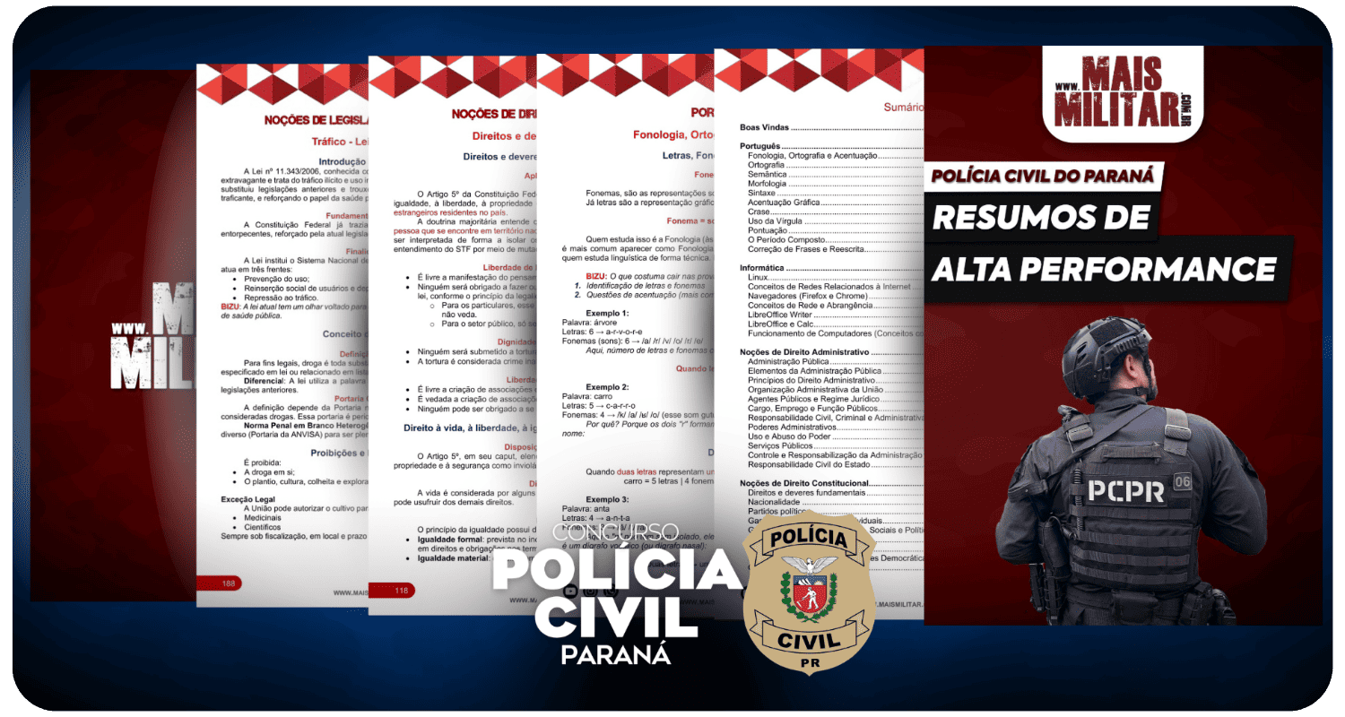 Este material foi criado com base no último edital e tem objetivo de oferecer um estudo direto ao ponto, ideal para quem deseja revisar ou consolidar o conteúdo sem perder tempo com teorias extensas e desnecessárias. O método utilizado foca naquilo que “verdadeiramente importa”, baseado na análise das cobranças recorrentes da banca e do histórico de provas da PCPR.